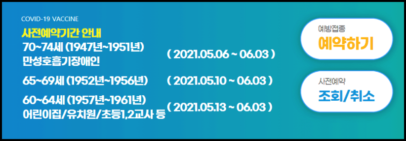 지난 4월 1일 75세 이상 부터 시작하여 5월 6일부터 6월 3일까지는 60세부터 74세까지 예약을 받고 있습니다. 백신 관련 예방접종사전예약, 접종증명서 발급 안내 새창; #백신사전예약확인 및 조회는 예약사이트 첫 화면에서 사전예약확인 및 취소 를 클릭해서 들어가면 되구요. 사진=뉴시스 파이낸셜뉴스 오늘부터 65~69세 어르신의 코로나19 예방백신 예방접종 예약이 시작된다. 온라인 코로나19 사전예약 시스템으로 예약 위 방법은 질병관리청에 문의하여 확인하였습니다.